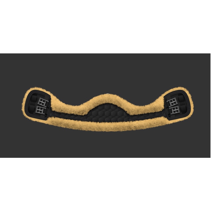 Hochwertiger Kurzgurt mit abnehmbarem Lammfellüberzug und speziellen SOFT-EDGE Kanten, um Druck und scheuern zu verhindern. Der Gurt ist mit einer Einlage aus POLY-FLEX® gepolstert. Die Schnallen und der D-Ring bestehen aus Edelstahl. Dieser Gurt ist besonders für Pferde mit kurzem Rücken, einen weitem Rippenbogen oder einer sehr schmalen Brust geeignet, da die Mondform ein Rutschen verhindert.