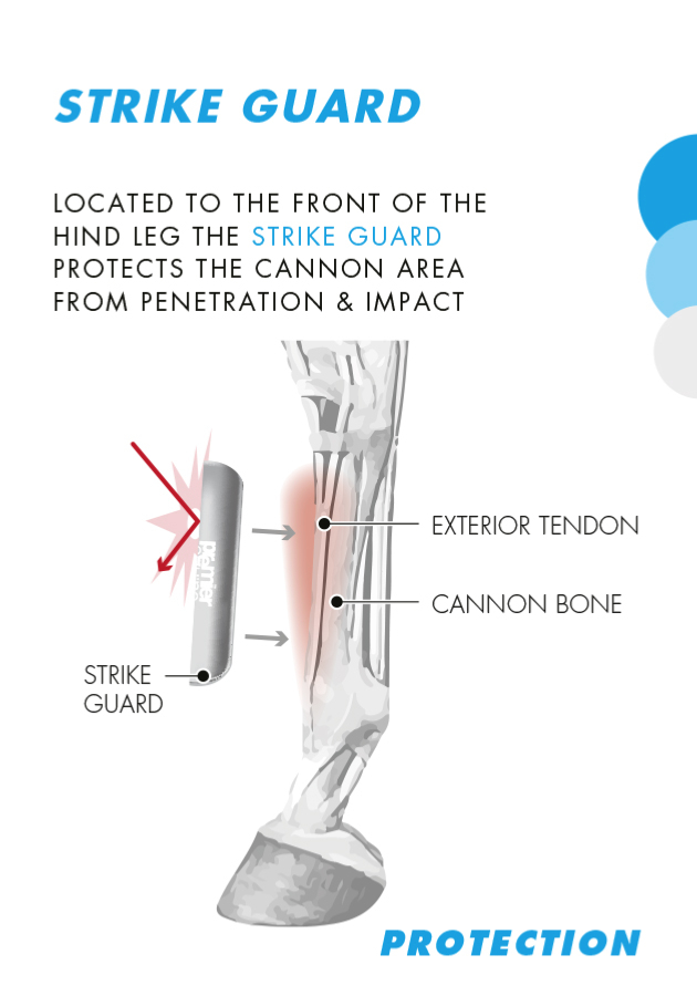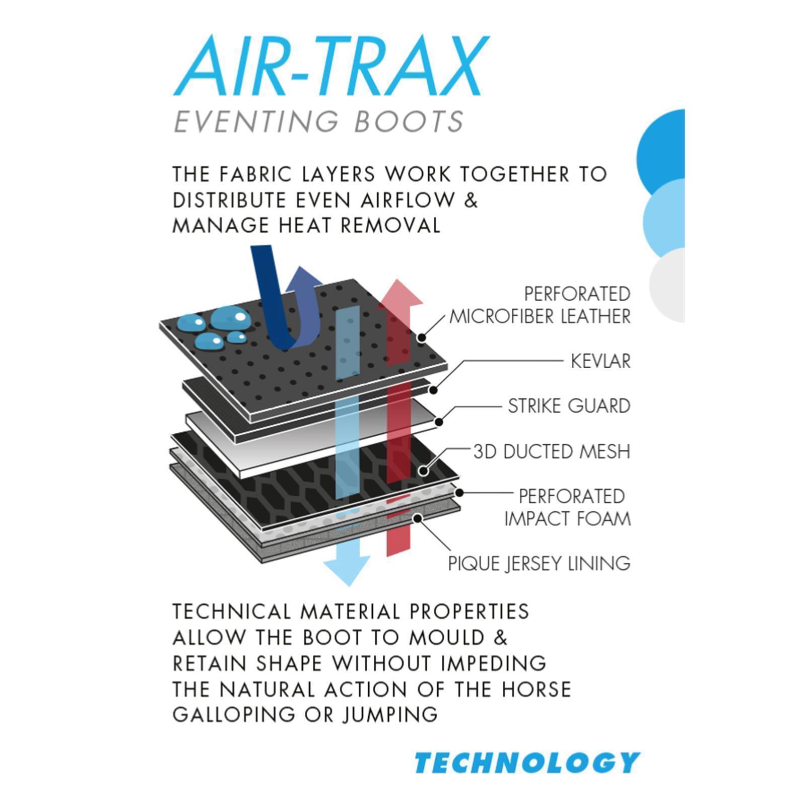 Die neuen, luftdurchlässigen Air Trax Geländegamaschen bieten maximalen Beinschutz, höchsten Schlagschutz und verteilen bzw. absorbieren den Schlag. Die Gamaschen sind aus speziell dafür entwickelten Materialien zusammengesetzt: maximale Strapazierfähigkeit, Atmungsaktivität und Tragekomfort. Darüberhinaus bieten die Air Trax den P.E. Polycarbonat Sehnenschutz. Der Schnitt der Gamaschen schmiegt sich der Kontur des Pferdebeins an und behindert somit nicht beim Galoppieren und Springen. Die Gamaschen sind leicht und flexibel und saugen sich nicht voll Wasser, sie bieten maximalen Schutz und eine sichere Passform. Die Sehnen hinten und das Röhrbein vorne werden durch einen Polycarbonat-Schlagschutz vor Verletzungen geschützt - darüberhinaus polstert/schützt über dem Polycarbonatschlagschutz an der Vorderseite der Air Trax Gamasche noch eine Kevlar Einlage das Bein (Kevlar ist ein exzellentes Schutzmaterial, 5 x stärker als Stahl und sehr strapazierfähig, es absorbiert den Schlag).